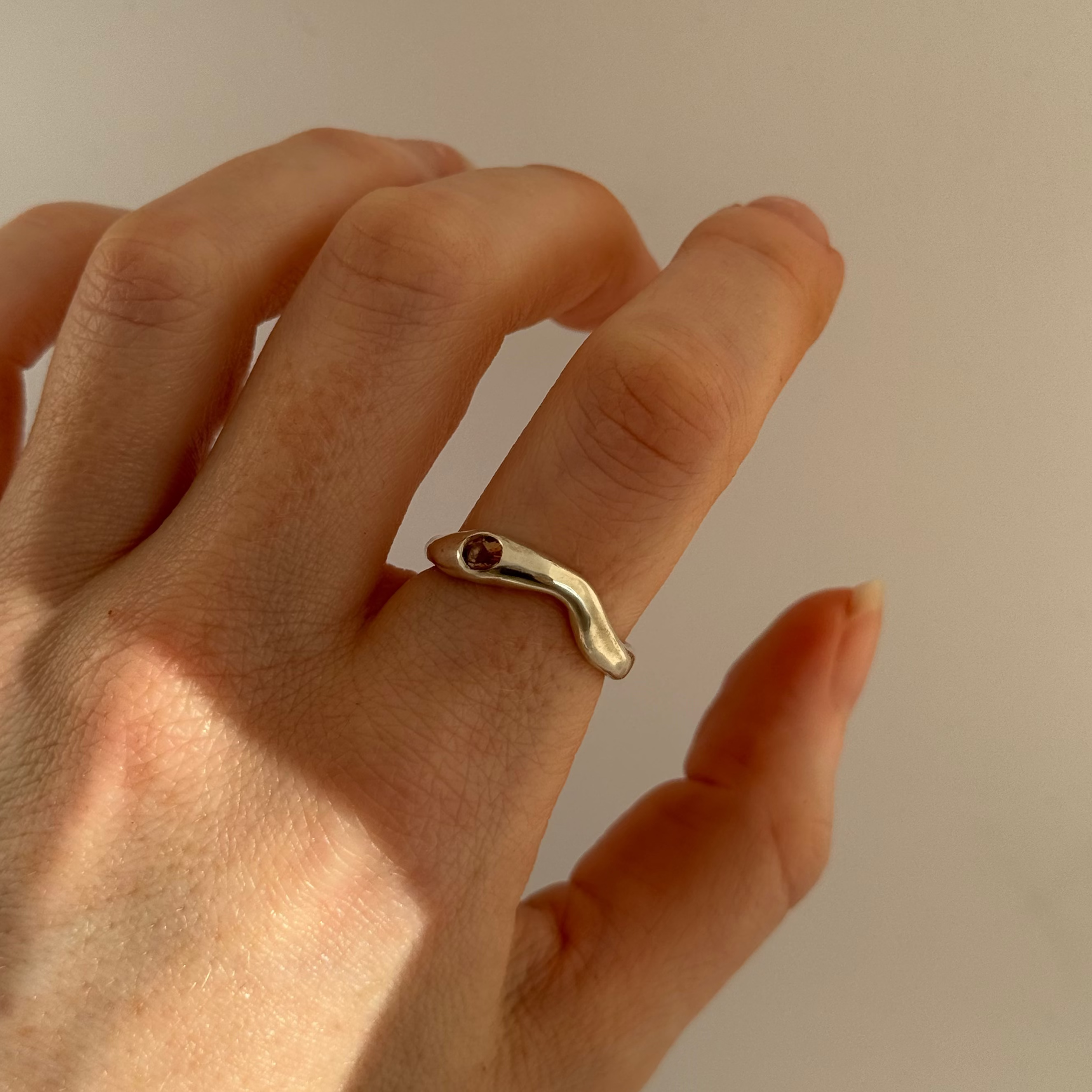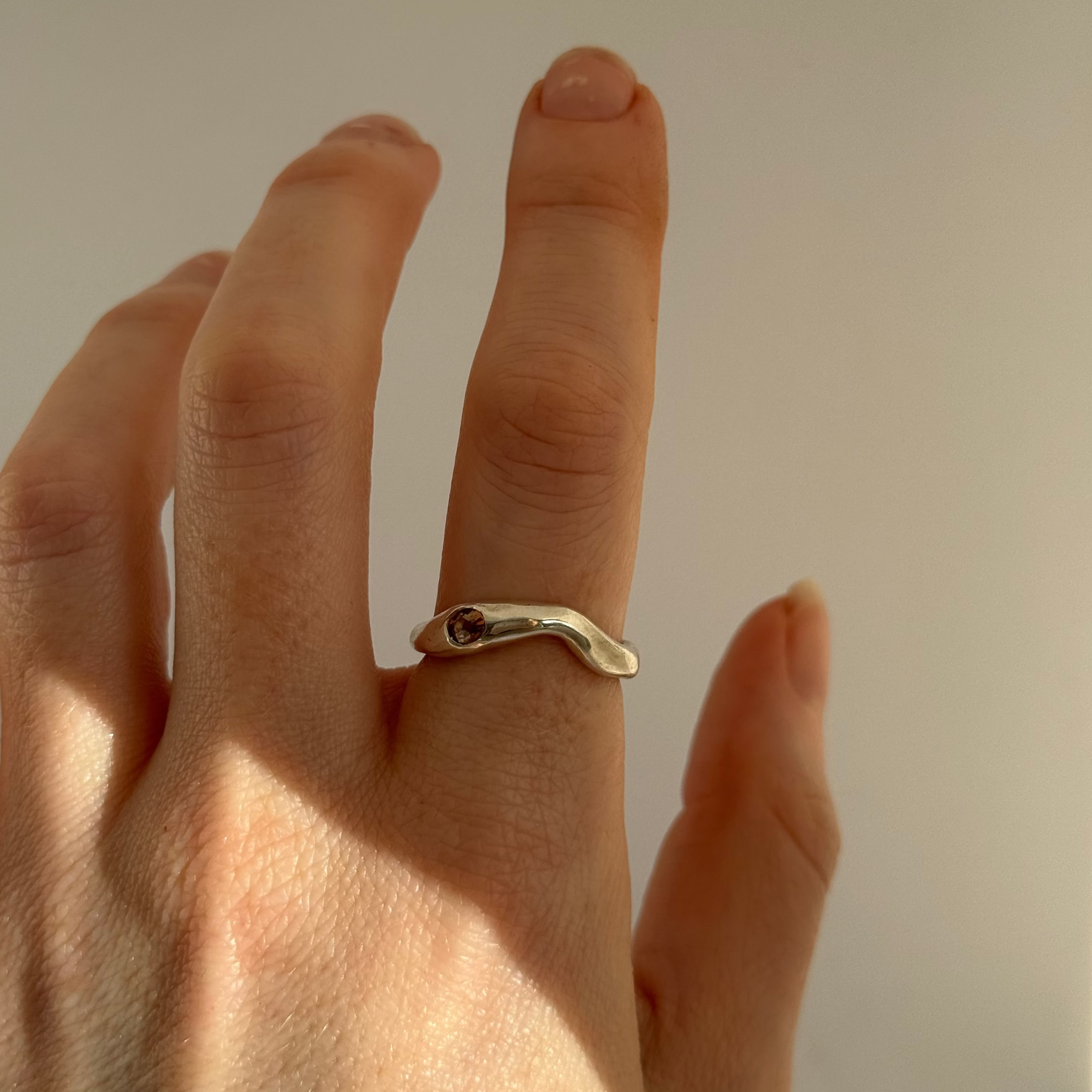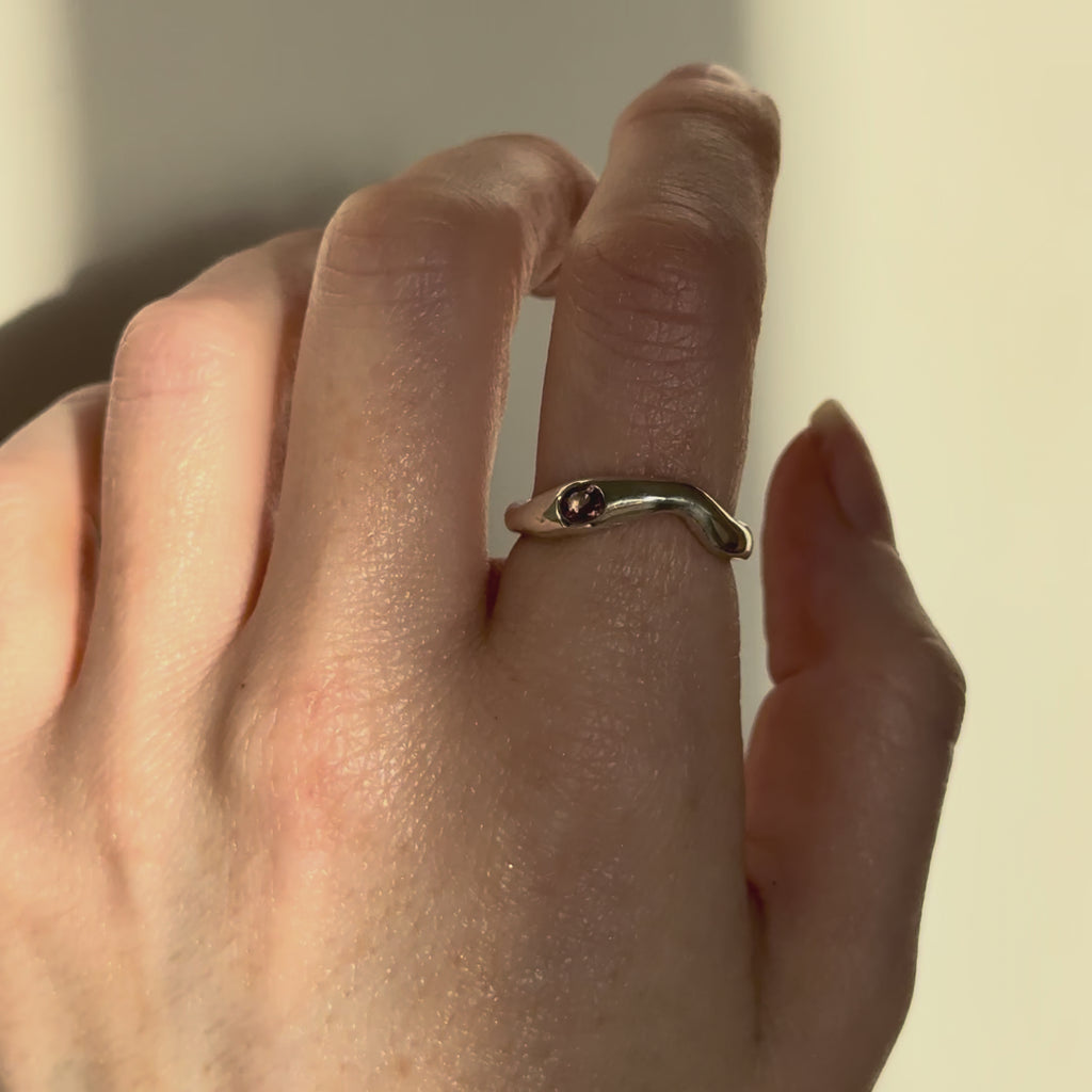 A hand-carved one of a kind flow wave Sterling Silver ring featuring a flush set Peach Tourmaline. This ring is a size M.