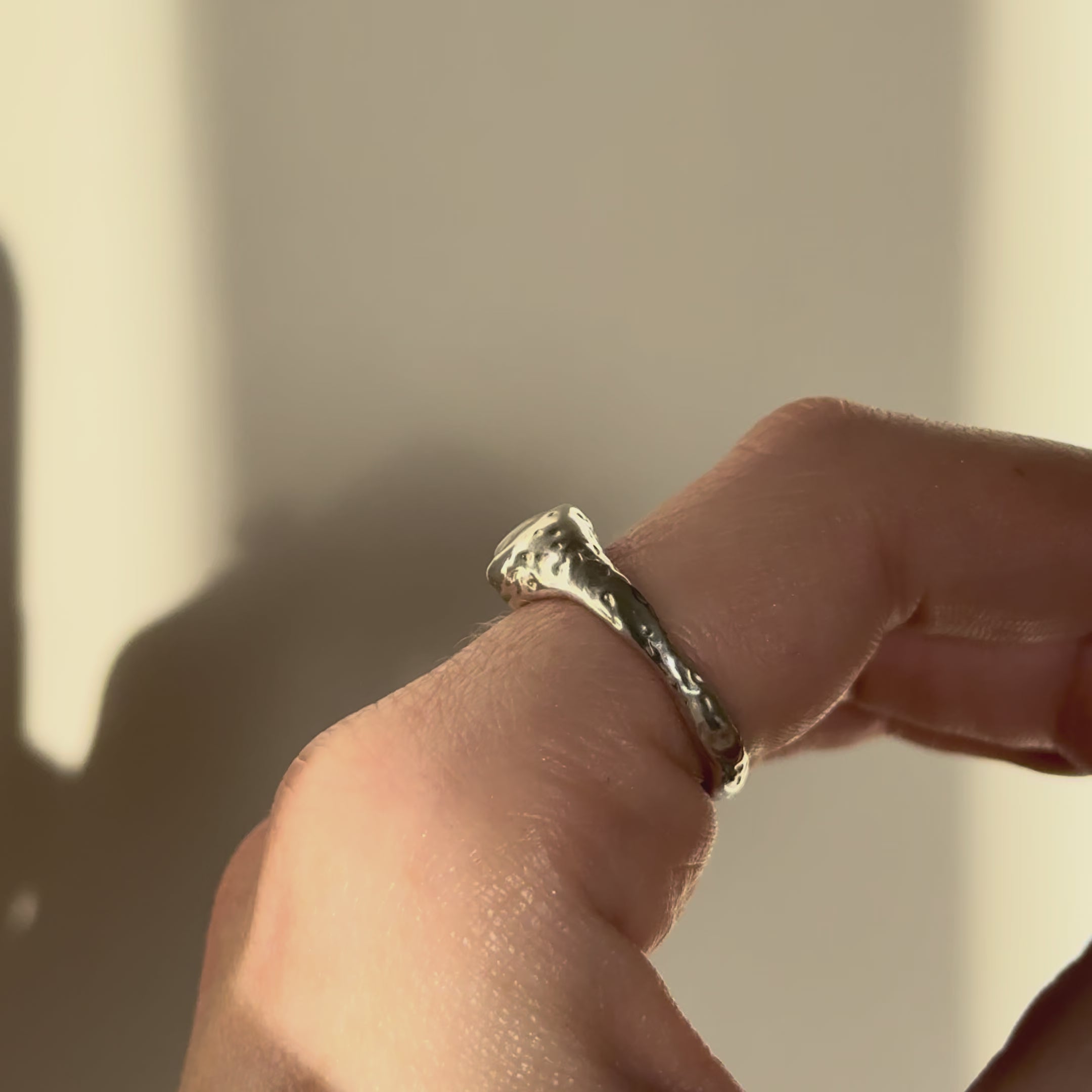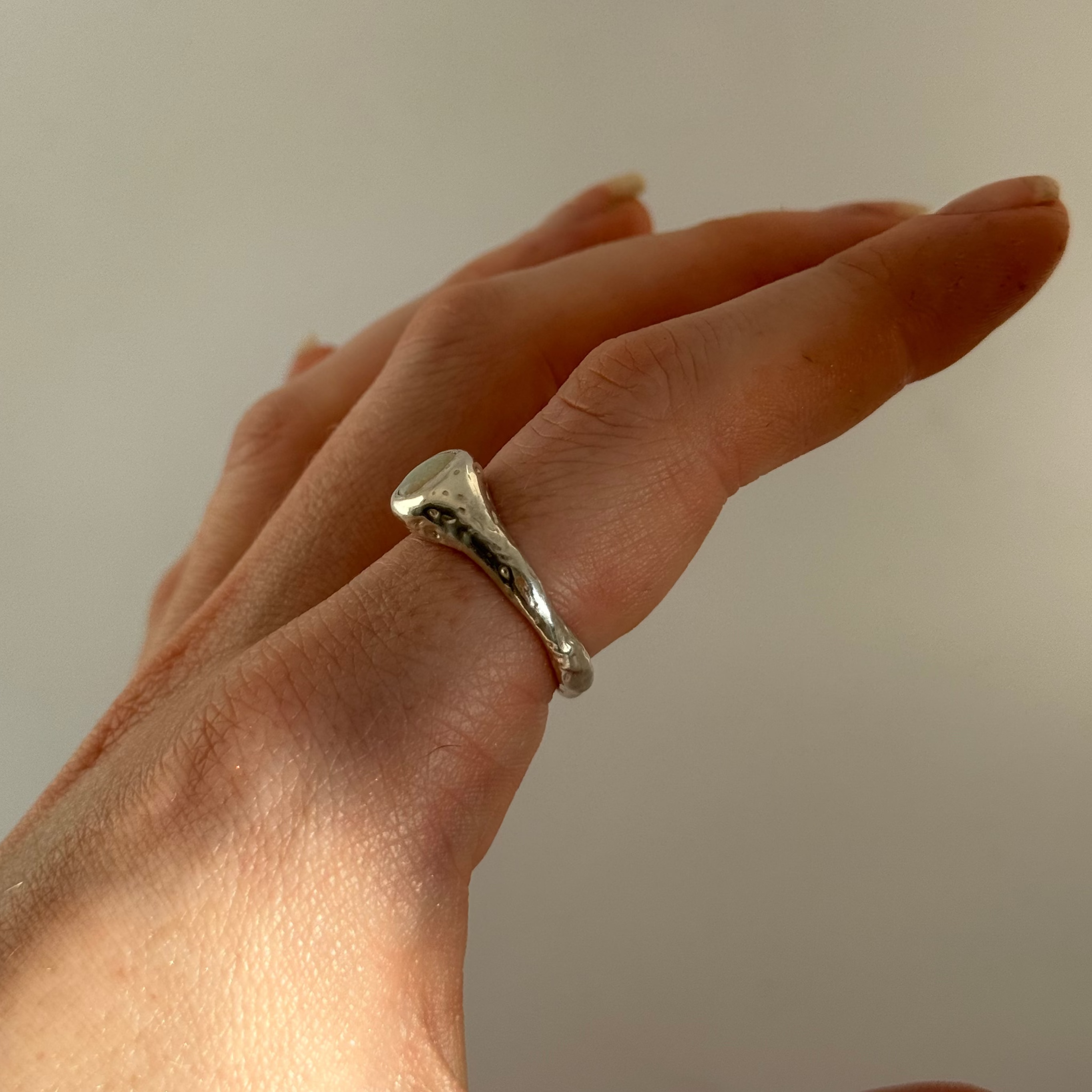 A hand-carved one of a kind Sterling Silver textured flow ring featuring a flush set Australian Opal. This ring is a size M.