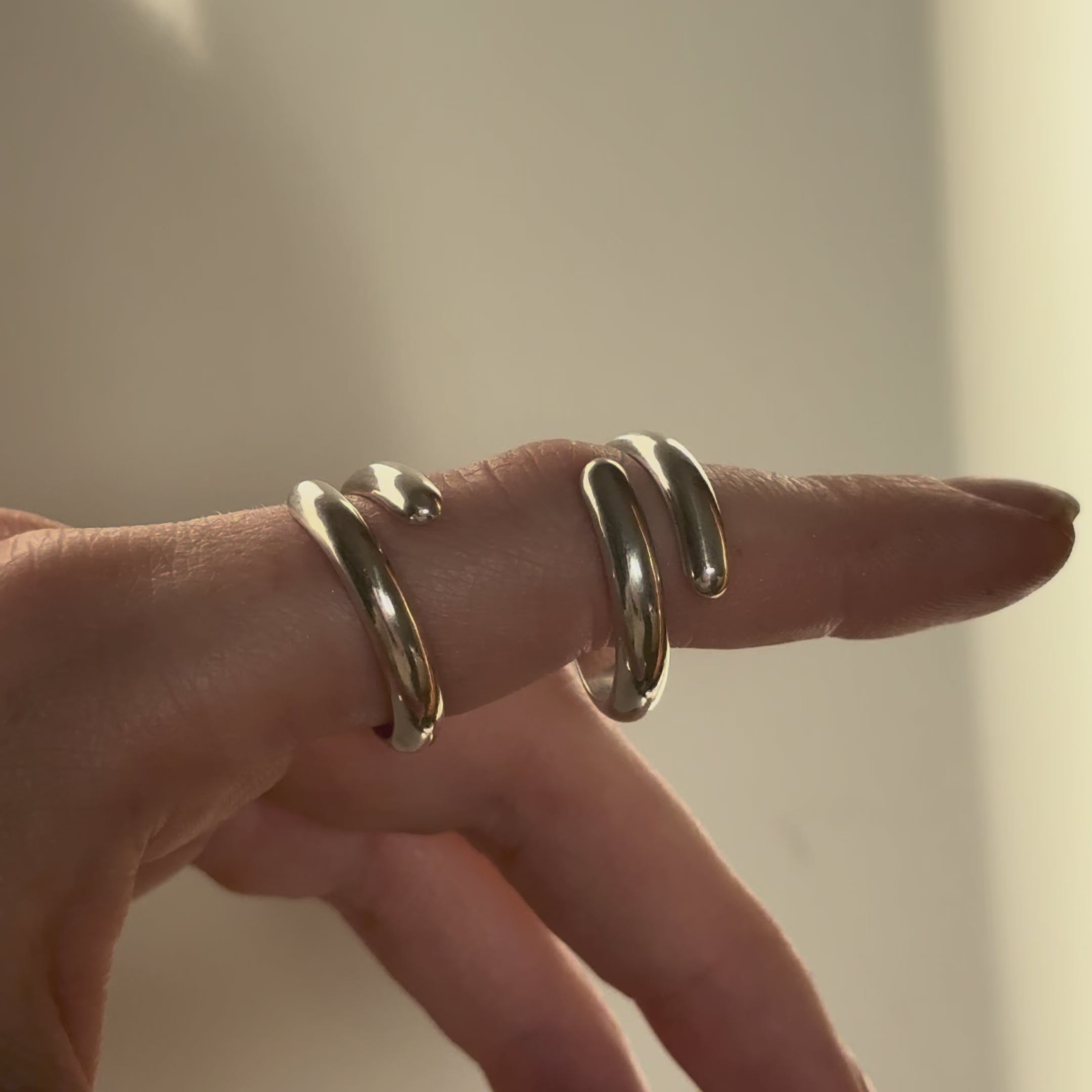 A hand-shaped, open twist Sterling Silver ring. Two sizes are available: one fits M-N, and the other fits Q-R. Each piece is ready to ship.
