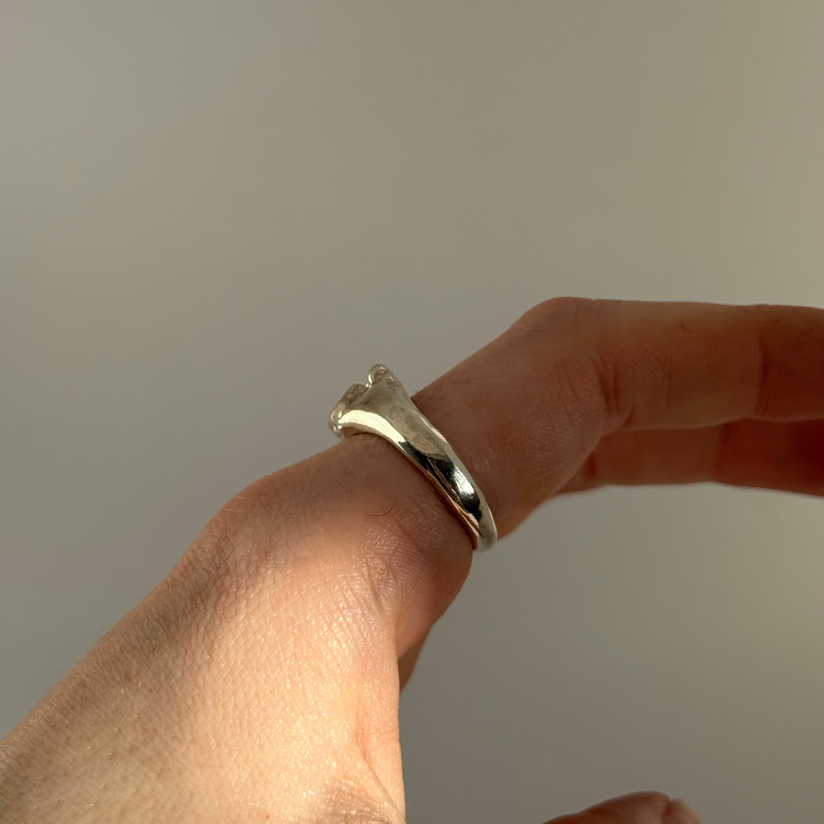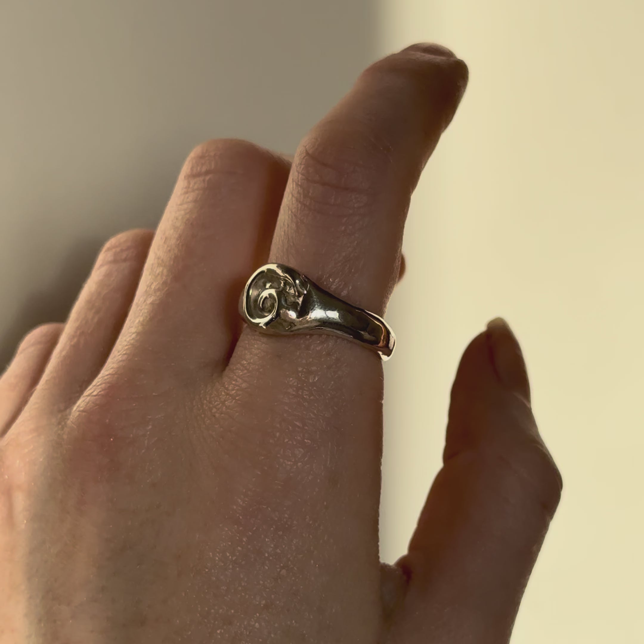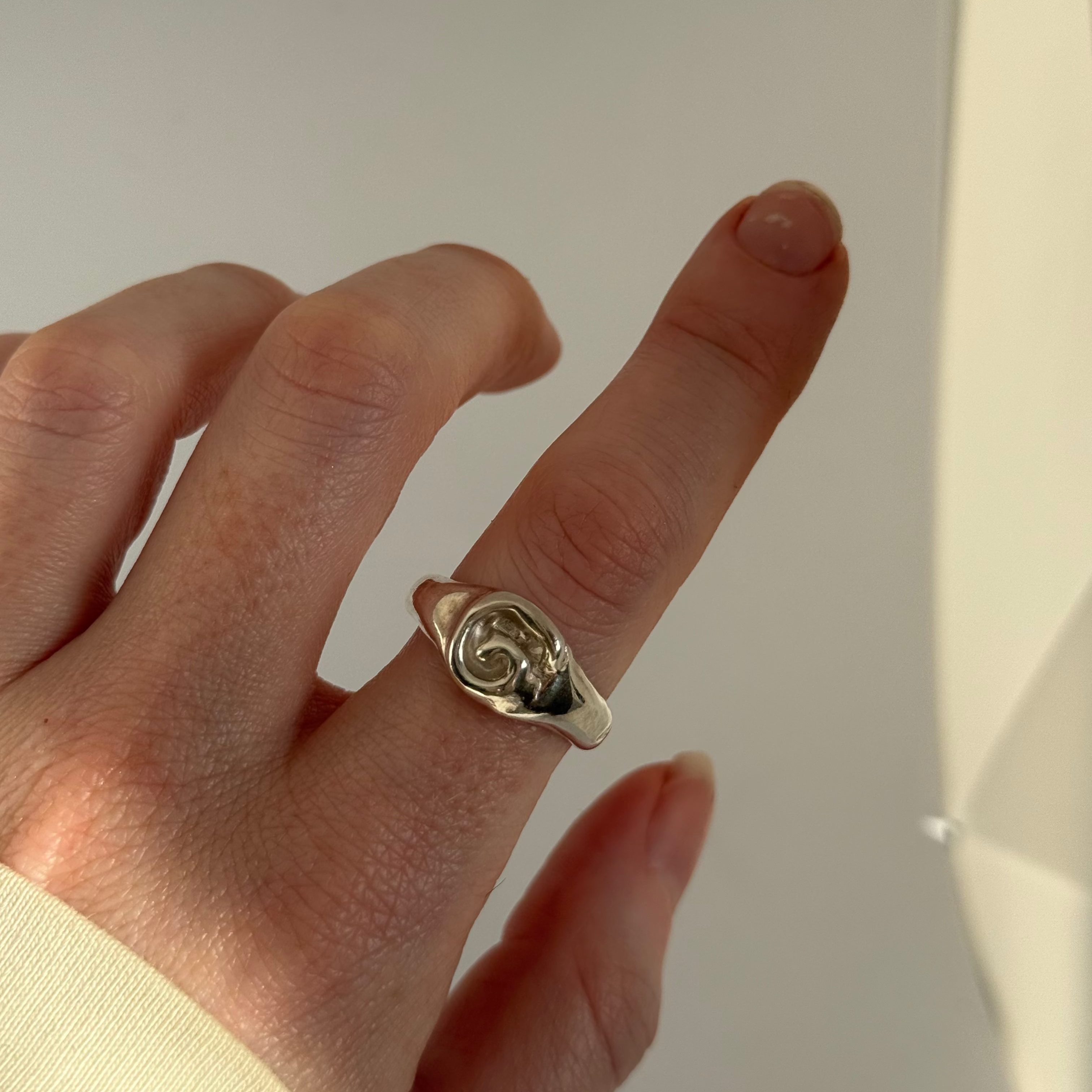 A hand-carved swirly Sterling Silver signet ring. This ring is a size O 1/2.